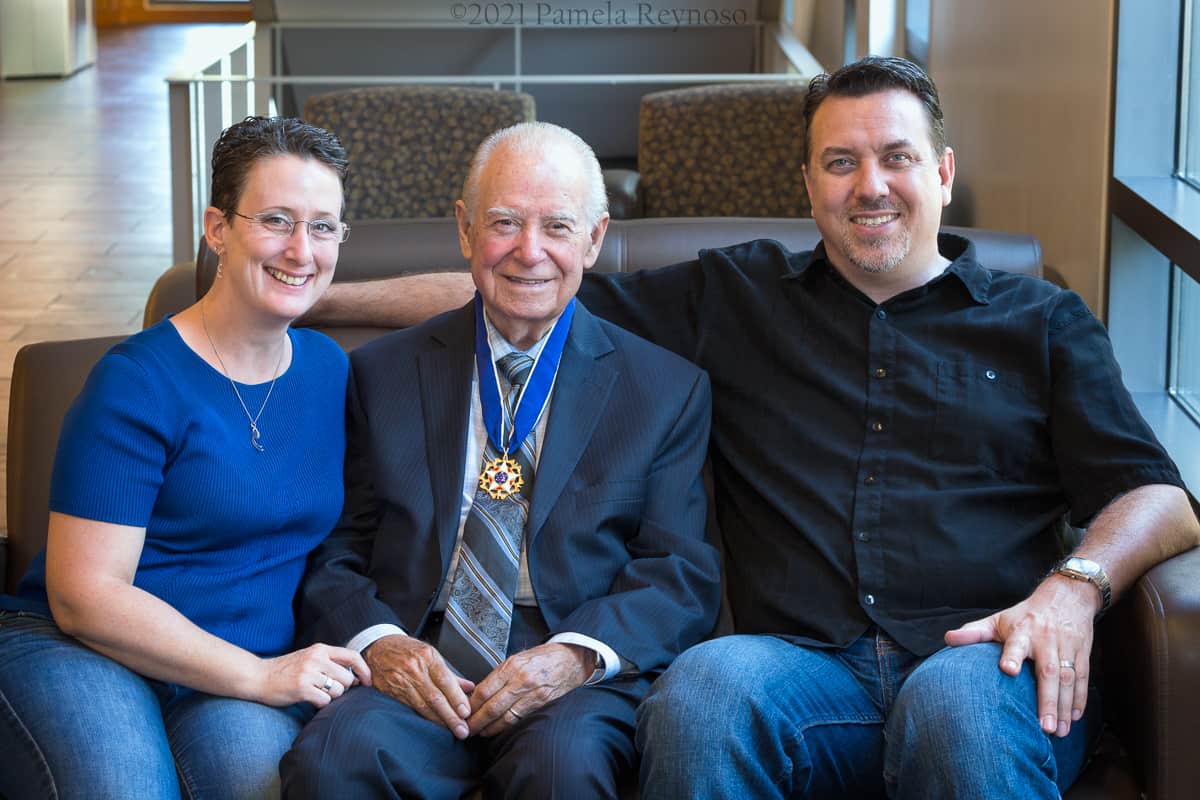 Cruz Reynoso wearing the Presidential Medal of Freedom, Pamela Reynoso, and Rondall Reynoso sit on a couch at U.C. Davis School of Law.